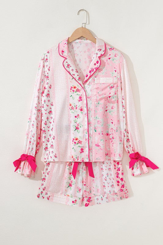 Floral Shirt Satin Tie and Shorts Pajama Set